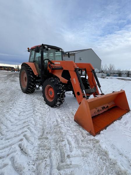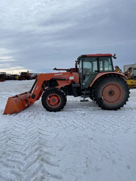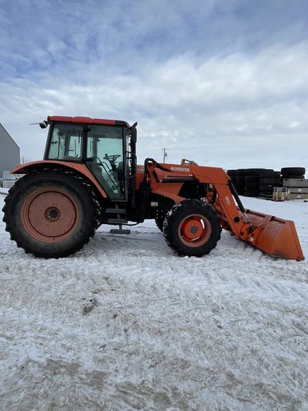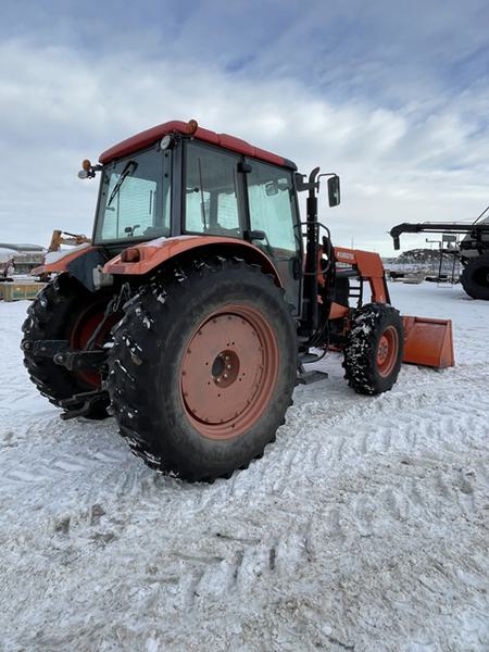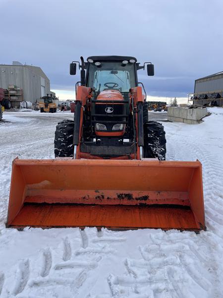 14.8x24 front tires, 18.4x38 rear tires, 3 POINT HITCH, PTO 540, Rear weights 160 lbs, Semi-PS, Standard Drawbar, 3 Mech Hydraulic remotes, Standard Hydraulic Pump, std cab, CLOTH SEAT, 2011 M51 Kubota Self Leveling loader, 86'' bucket